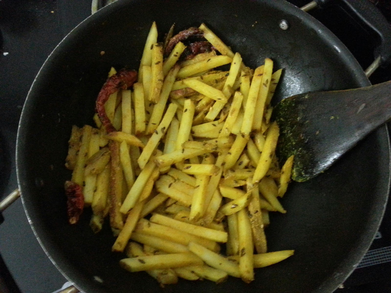 3. Once the jeera and chillies stop spluttering put in the potatoes. Stir it so the potatoes are covered with the oil and jeera. Cook for 2 minutes.