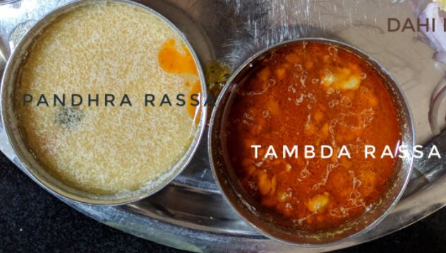 The Pandhra rassa is a lovely white mutton stock base, lightly spiced. Dunk your bhakri and mutton fry to oomph up the flavors, or drink it up as a soup.