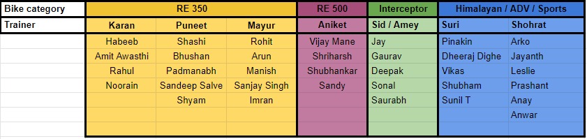 The groups were split up very logically into 7 groups, based on the type of bike and the power/weight dynamics of the bike. This categorization made a lot of sense since though the basic theory/techniques remain the same, the weight and power of the bike play a huge part in the way it would behave while riding.